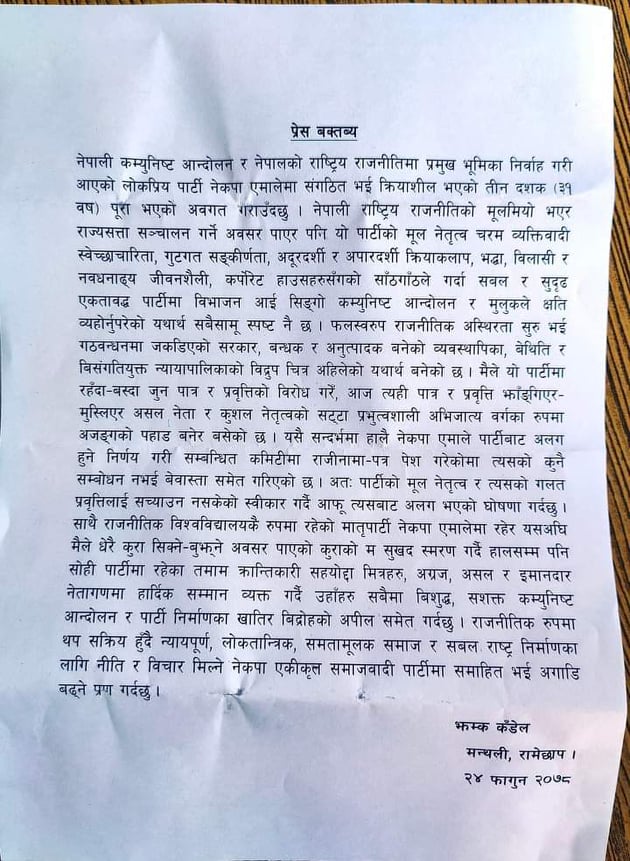 पार्टीमा बुझाएको राजिनामा लामो समयसम्म स्वीकृत नभएपछि आफूले पार्टीमा उठाएको माग सम्बोधन नभएको भन्दै एकीकृत समाजवादीमा प्रवेश गर्ने निर्णय लिएको बताए ।