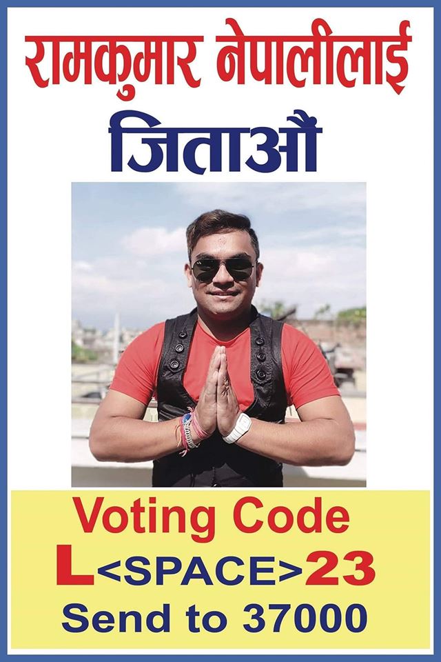 रामेछाप जिल्लामा जन्मिएका रामकुमार नेपालीलाई भोट गर्नको लागि तपाईंको आफ्नो मोबाइलको म्यासेज बक्स मा गएर एल टाइप गरि १ स्पेस दिएर उनको को भोटिङ कोर्ड २३ लेखी ३७००० मा सेण्ड गरि गरी भोट गर्न सकिनेछ ।