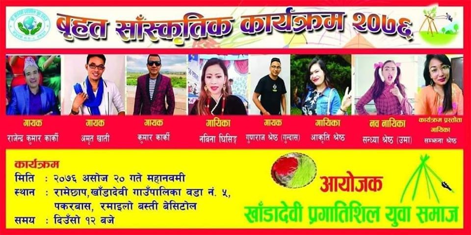 रामेछापको खाँडादेवी गाउँपालिका–५ पकरबासस्थित रमाइलो बस्तीमा दैशको अवसरमा रमाइलो हुने भएको छ । दशै तथा दिपावलीको अवसरमा खाँडादेवी प्रगतिशिल युवा समाजले शुभकामना कार्यक्रम आयोजना गरेको हो । समाजका अध्यक्ष राकेश श्रेष्ठले दशैको अवसरमा शुभकामनासँगै सांस्कृतिक कार्यक्रम आयोजना गरिएको रामेछाप न्युजलाई बताउनुभयो । असोज २० गते पकरबासस्थित रमाइलो बस्ती बेसींटोलमा कार्यक्रम आयोजना गरिएको हो ।
