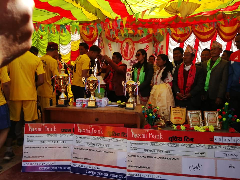 राकाथुमस्थित समाज कल्याण मगर सेवा समितिको खेलकुद मैदान खानीगाउँमा भएको प्रतियोगीता खाँडादेवी युवा क्लब खाँडादेवी–७ थान्सिङले दोस्रो हुँदै ३१ हजार नगद हात पारेको छ भने युवा तथा खेलकुद विकास समिति सुनापती– २ दिमीपोखरी तृतिय हुँदै २१ हजार नगद प्राप्त गरेका छ । ११ हजार नगद सहित दोरम्बा गाउँ पर्यटन विकास समिति दोरम्बा गाउँपालिका–२ दोरम्बले ले सान्तोना स्थान हात पार्न सफल भयो । विजयी टिम र खेलाडीलाई सिल्ड मेडल र प्रमाणपत्र पनि प्रदान गरिएको थियो ।