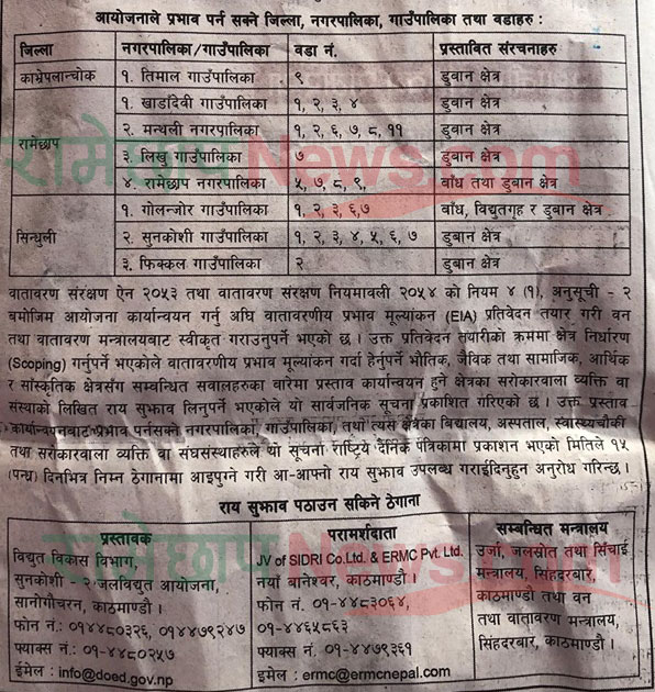 आयोजनाबाट प्रभाव पर्नसक्ने नगरपालिका, गाउँपालिका तथा त्यस क्षेत्रका विद्यालय, अस्पताल, स्वास्थ्यचौकी तथा सरोकारवाला व्यक्ति वा संघसस्थाहरुले राय सुझाव पठाउनु पर्नेछ । सुनकोसी दोस्रो र तेस्रो जलाशययुक्त आयोजनाको सम्भाव्यता अध्ययन गर्ने जिम्मेवारी लिएको परामर्शदाता कम्पनी इआरएमसीका सञ्चालक उद्धवराज चौलागाईले विभागले माग गरे अनुसारको प्रभावित क्षेत्रका बासिन्दाहरुले सुझाव उपलब्ध गराउन आग्रह गर्नुभयो ।