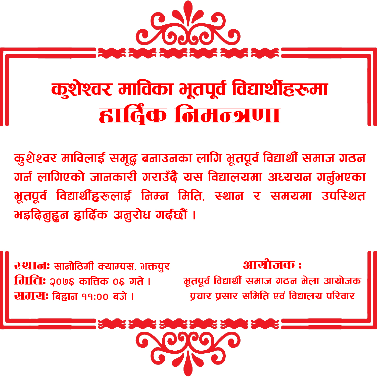 विद्यालयको पहलमा राजधानी काठमाडौंमा बस्दै आएका भूतपूर्व विद्यार्थीहरुलाई एकीकृत बनाउदै सुझाव लिने उदेश्यको साथ कार्तिक ६ गते ११ बजे भक्तपुरको सानोठिमी क्याम्पसमा भूतपूर्व विद्यार्थीहको भेला हुने भएको हो । विं सं. २०१४ सालमा स्थानापना भएको कुशेश्वर माविबाट हालसम्म करिब १८ सय विद्यार्थी उत्पादन गर्न सफल भएका छ । यस माविमा अध्ययन गरेका विद्यार्थीहरु सरकारको उच्च तहमा पुग्न समेत सफल भएका छन् ।