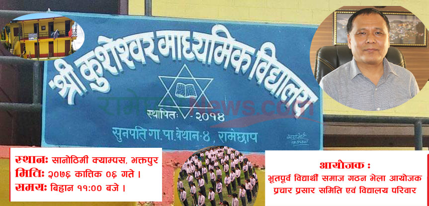 रामेछाप जिल्लाको नमूना विद्यालय घोषित सुनापती गाउँपालिका–४ बेथानको कुशेश्वर माविमा अध्ययन गरेका भूतपूर्व विद्यार्थीहरुको भेला हुने भएको छ । विद्यालयको शैक्षिक र भौतिक अवस्था सुधार गर्न भूतपूर्व विद्यार्थी समाज गठन गर्ने लागिएको हो ।