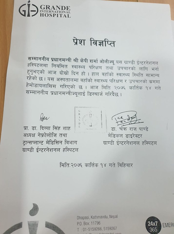 अस्पतालका मेडिकल डाइरेक्टर चक्रराज पाण्डेले बिहीबार पत्रकार सम्मेलन गरी प्रधानमन्त्रीको उपचारको क्रममा हेमोडायलाइसिस गरिएको जानकारी दिँदै अहिले स्वास्थ्य अवस्था सामान्य रहेकाले डिस्चार्ज गर्ने निर्णय गरिएको जानकारी दिनुभयो ।