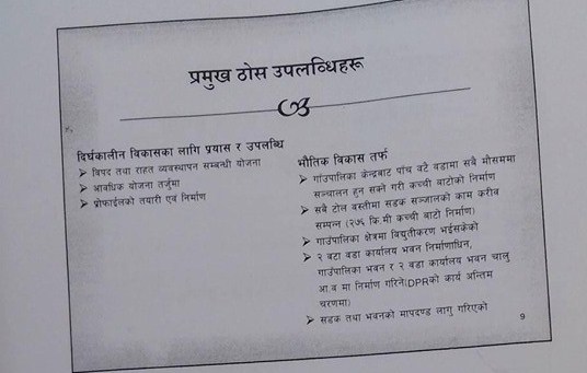गाउँपालिकाले दिर्घकालिन विकासका लागि विपद् तथा राहत व्यवस्थापन सम्बन्धि योजना, अवधिक योजना तर्जुमा र प्रोफाइलको तयारी एवं निर्माणलाई उपलब्धि भनेको छ । आवधिक योजनाले आगामी दिनमा प्राथमिकता निर्धारण गरेर विकास निर्माणको काम अगाडि बढाउन सहज हुने गाउँपालिकाका प्रवक्ता कमल केसीले रामेछाप न्युजलाई बताउनुभयो ।