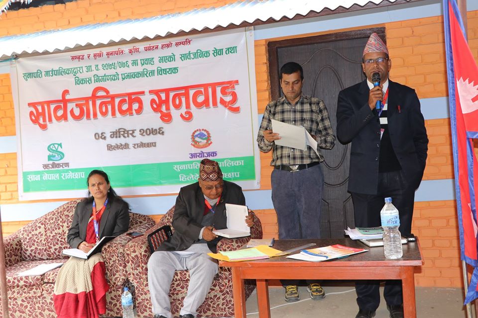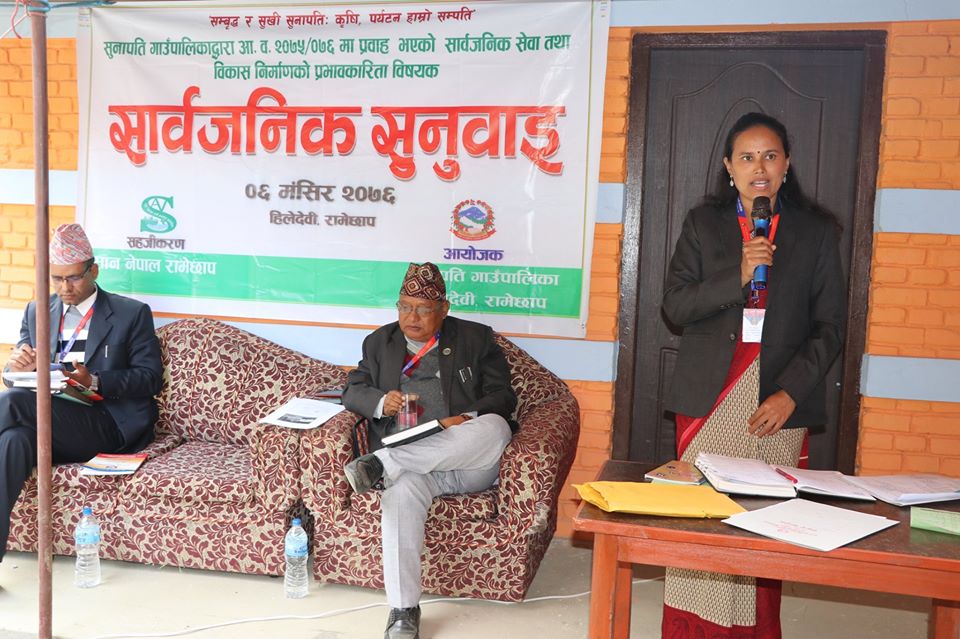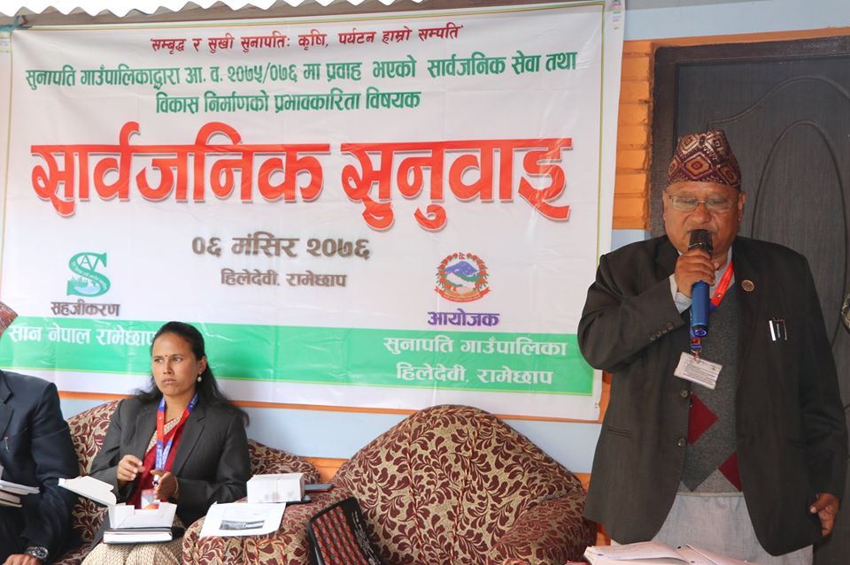 आर्थिक वर्ष २०७५÷०७६ भित्र भएका कामको जानकारी दिन गाउँपालिकाले आयोजना गरेको सार्वजनिक सुनुवाई कार्यक्रममा आफ्नो धारणा राख्दै अध्यक्ष लामाले सडक स्वास्थ्य, शिषा, खानेपानी सामाजिक सुरक्षा लगायतको काममा धेरै सुधार ल्याएको दावी गर्नुभयो ।