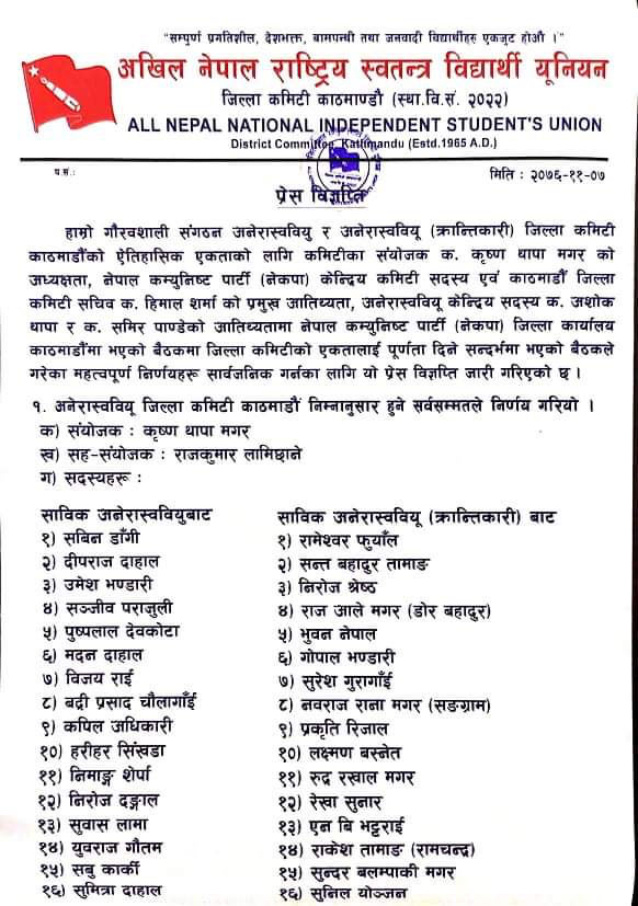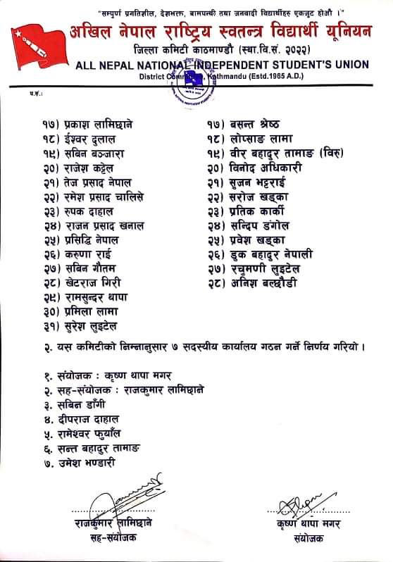 यस्तो छ अनेरास्ववियू काठमाडौं जिल्ला कमिटीको नामावलीः