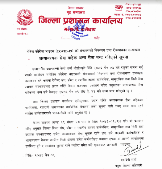 अत्यावश्यक बाहेकका सेवा बन्द गरिएको जिल्ला प्रशासन कार्यालय रामेछापको सूचना