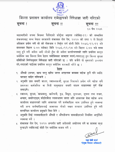 जारी निषेधाज्ञामा स्वास्थ्य , सरक्षा,खाद्य वस्तु , खानेपानी , दुध ,विद्युत ,दुरसञ्चार , सूचना तथा सञ्चार,भन्सार , क्वारेन्टाइन , फोहोरमैला व्यवस्थापन जस्ता अति आवश्यक सेवा बाहेक अन्य कार्यालय संचालनका लागि आवश्यक पर्ने कर्मचारीहरु मात्रै उपस्थित हुने व्यवस्था गरी अन्य कर्मचारीहरुलाई आवश्यक परेको बेलामा तत्काल उपस्थित हुने गरी सम्बन्धित कार्यालय प्रमुखलाई विदा दिन भनिएको छ । सूचनामा यदि कसैले कर्फ्युको अवहेलना गरे वा काममा वाधा पुर्याउने व्यक्तिलाई संक्रामक रोग ऐन २०२० अनुसार कारवाही गरिने चेतावनी पनि दिइएको छ ।