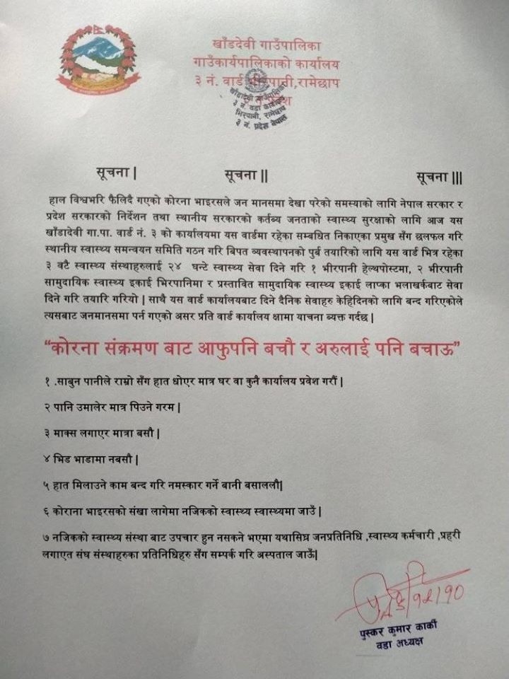 कोरोना भाइरसको संक्रमित गाउँपालिकाभित्र प्रवेश नगरुन भनेर हेल्थ डेक्स सञ्चालनमा ल्याएको वडा अध्यक्ष पुष्कर कुमार कार्कीले बताउनुभयो । उहाँले रामेछाप न्युजसँग भन्नुभयो,‘सरकारले लकडाउन गरेको छ, तर पनि गाउँपालिकाभित्र प्रवेश गर्ने नागरिकहरु आउने क्रम जारी छ, आज मात्र दुई सय भन्दा बढी नागरिकहरु गाउँपालिका प्रवेश गरेका छन् ।’ वडा अध्यक्ष कार्कीले रामेछापवासी भएको परिचयपत्र खुल्न कागतजात देखाएर मात्र प्रवेश गर्न दिने गरेको बताउनुभयो ।