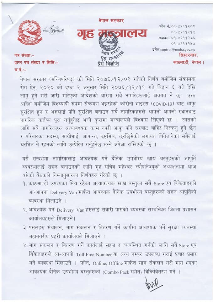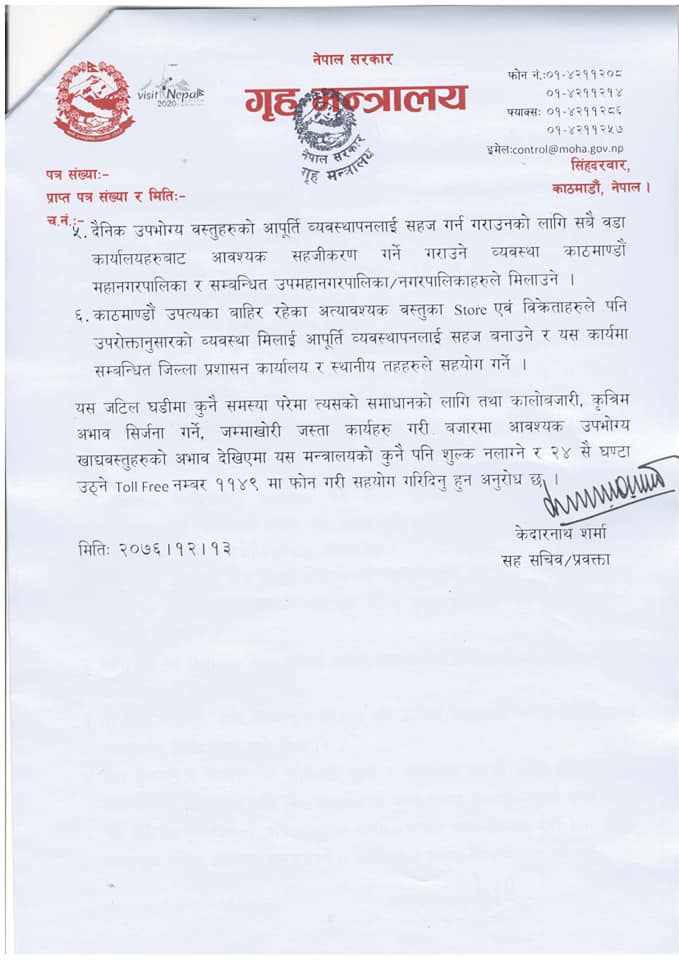 कालोबजारी कृत्रिम अभाव सिर्जना गर्ने जम्माखोरी जस्ता कार्यहरु गरी बजारमा आवश्यक उपभोग्य खाद्यवस्तुहरुको अभाव देखिएमा गृह मन्त्रालयको कुनै पनि शुल्क नलाग्ने र २४ सै घण्टा उठने टोल फ्री नम्बर ११४९ मा फोन गरी सहयोग गरिदिन गृहमन्त्रालयका प्रवक्ता केदारनाथ शर्माद्धारा जारी गरिएको विज्ञप्तीमा जनाइएको छ ।
