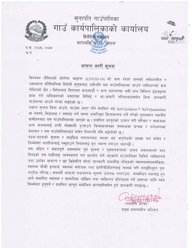 सुनापती गाउँपालिकाले विदेशबाटहरुलाई अनिवार्य रुपमा क्वारेन्टाइनमा राख्ने काम सुरु गरेको छ । गाउँपालिकाले वडा नम्बर १ गुन्सीमा पाँच र वडा नम्बर ३ हिलेदेवीमा पाँच जनालाई होम क्वारेन्टाइमा राखेको हो । हिलेदेवीमा क्वारेन्टाइनमा राखिएका व्यक्ति पाँचौ कोरोना संक्रमित महिला आएको प्लेनमा नेपाल आएको बताइएको छ ।