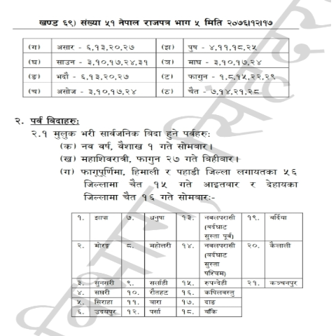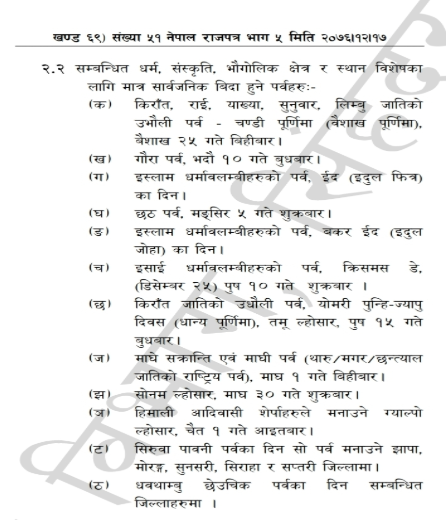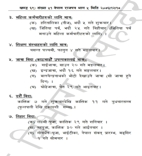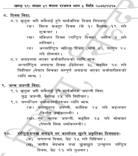 त्यस्तै, वसन्त पञ्चमीमा फागुन ४ गते शिक्षण संस्थाहरु बिदा हुनेछन् । अन्तर्राष्ट्रिय अपांग दिवसमा मंसिर १८ मा अपांगता भएका कर्मचारीका लागि बिदा दिइनेछ ।