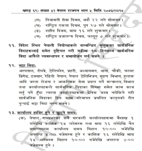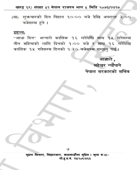 कार्यालय समय भने कात्तिक १६ गतेदेखि माघ १५ गतेसम्म १० बजेदेखि ४ बजेसम्म र अन्य समयमा १० बजेदखि ५ बजेसम्म हुनेछ । शुक्रबार आधा दिन ३ बजेसम्ममात्रै कार्यालय खुल्नेछ ।
