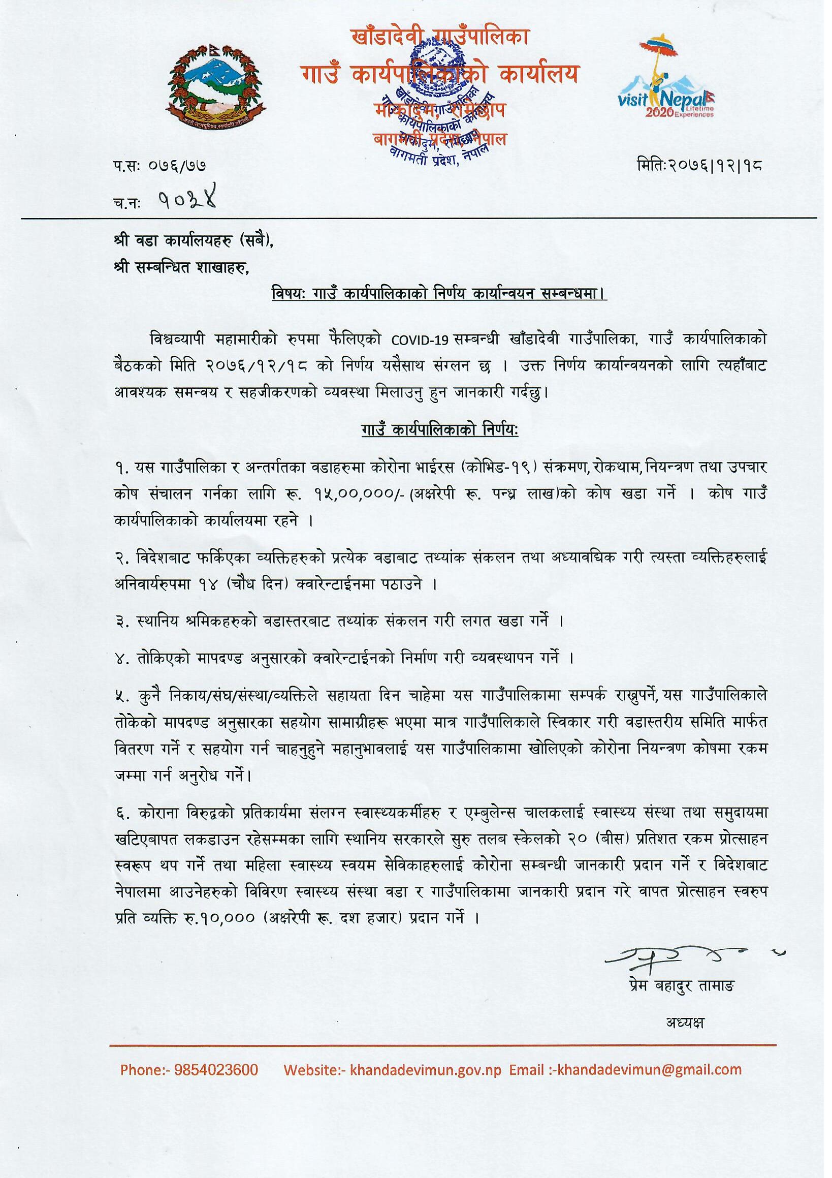 कोरोना रोकथाम गर्न खाँडादेवी गाउँपालिकाको ६ निर्णय