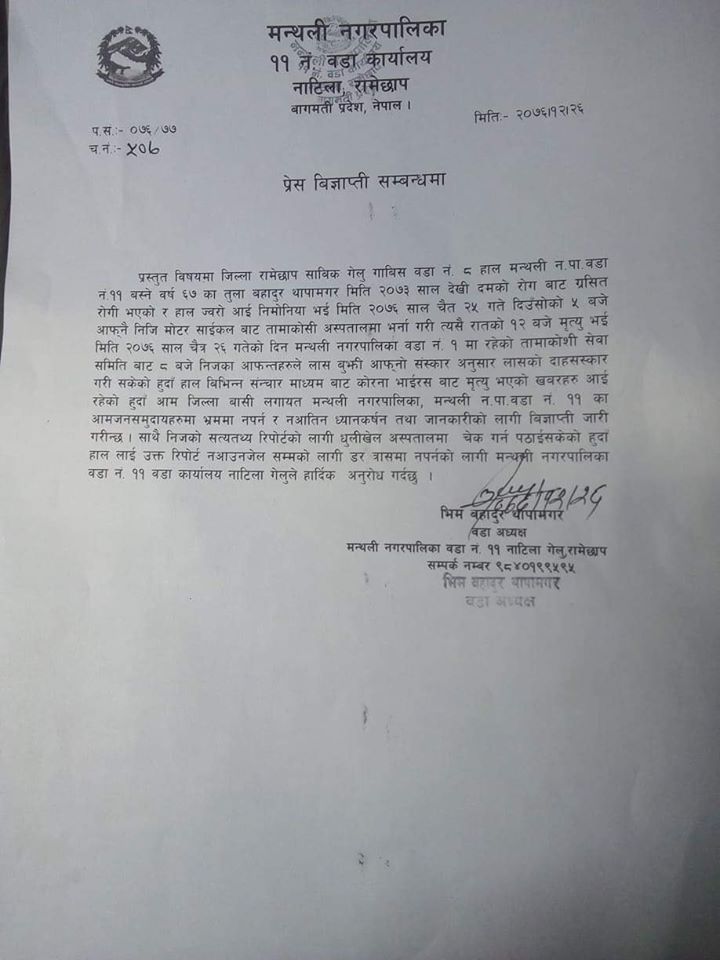वडाअध्यक्ष भिम बहादुर थापामगरले एक विज्ञप्ती जारी गर्दै हिजा साझ आफनै निवासबाट मोटर साइकलबाट तामाकोसी अस्पतालमा भर्ना भइ उपचारको क्रममा निधन भएकाले कोरोनाको आशंका नगर्न आग्रह गर्नुभएको छ । उहाँका अनुसार आज मन्थली नगरपालिका–१ मा रहेको तामाकोसी सेवा समितिबाट मृतृकका आफन्तले लाश बुझी आफ्नो संस्कार अनुसार दाहासस्कार गरिरहेका छन् ।