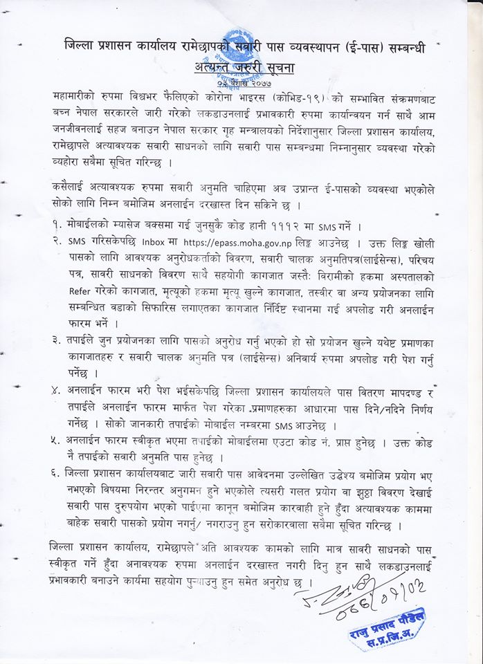 रामेछापका प्रमुख जिल्ला अधिकारी रुद्रादेवी शर्माद्धारा जारी विज्ञप्तीमा मोबाइलको म्यासेज बक्समा गई जुनसुकै कोर्ड हानी १११२ मा एसएमएस गर्न सकिने जानकारी गराउनुभएको छ । एसएमएस गरिसकेपछि इनबक्समा https:/// epass.moha.gov.np लिंग अाउनेछ । सवारी पास पाउनको लागि बिरामीको हकका अस्पतालले डिस्चार्ज गरेको कागजात, मृत्युको हकमा मुत्यु खुल्ने कागजात, तस्बीर वा अन्य प्रयोजनका लागि सम्बन्धित वडाको सिफारिस लगायतका कागजात अपलोड गरी अनलाईनमा फारम भर्नुपर्नेछ ।