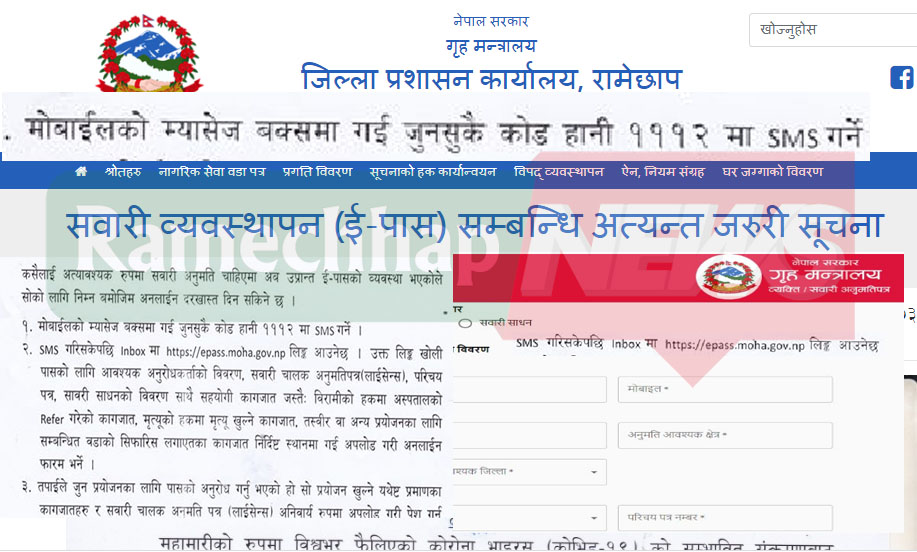 लकडाउनलाई थप प्रभावकारी बनाउन आजदेखि जिल्ला प्रशासन कार्यालय रामेछापले ई–पासको व्यवस्था लागू गरेको छ । अत्यावश्यक भएका सवारी अनुमति चाहिएमा एसएम मार्फत पासको लागि आवश्यक अनुरोधकर्ताले एसएमएस र अनलाइनबाट वितरण दिनुपर्ने भएको छ ।