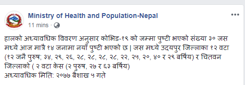 ५ वैशाक, काठमाडौं । कोरोनाबाट संक्रमितको संख्या शुक्रबार मात्रै १४ जना थपिएका छन् । शुक्रबार उदयपुरमा १२ जना र चितवनका २ जना गरी १४ जना थपिएको स्वास्थ्य मन्त्रालयका विज्ञ सल्लाहकार डा. खेम कार्कीले जानकारी दिनुभयो । उदयपुरको एक मस्जिदमा भेटिएका १२ मध्ये अधिकांश भारतीय नागरिक रहेको बताइएको छ ।