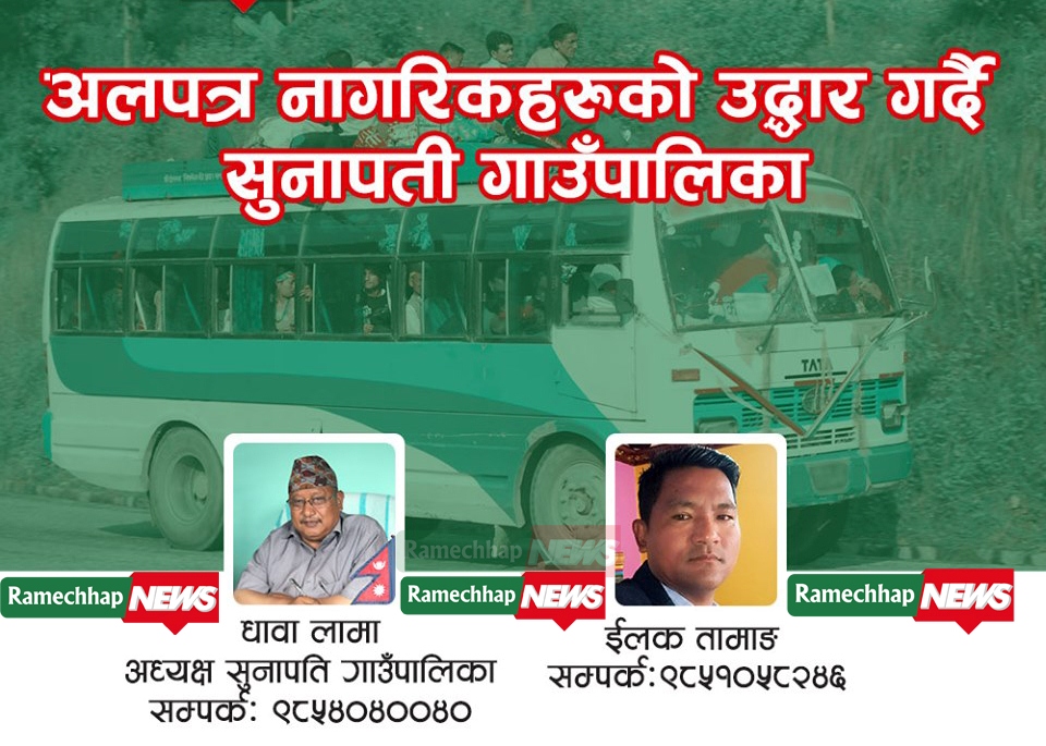 लकडाउनको कारण काठमाडौं उपत्यकामा अलपत्र परेका सुनापती गाउँपालिकाका बासिन्दालाई सुनापती गाउँपालिकाले निशुल्क रुपमा गाउँसम्म ल्याउने भएको छ । लकडाउनले गर्दा काठमाडौंमा खान बस्न समस्या भएको बताउदै गाउँपालिकाले अलपत्र परेका नागरिकहरुलाई सम्पर्क गर्न आग्रह गरेको हो ।