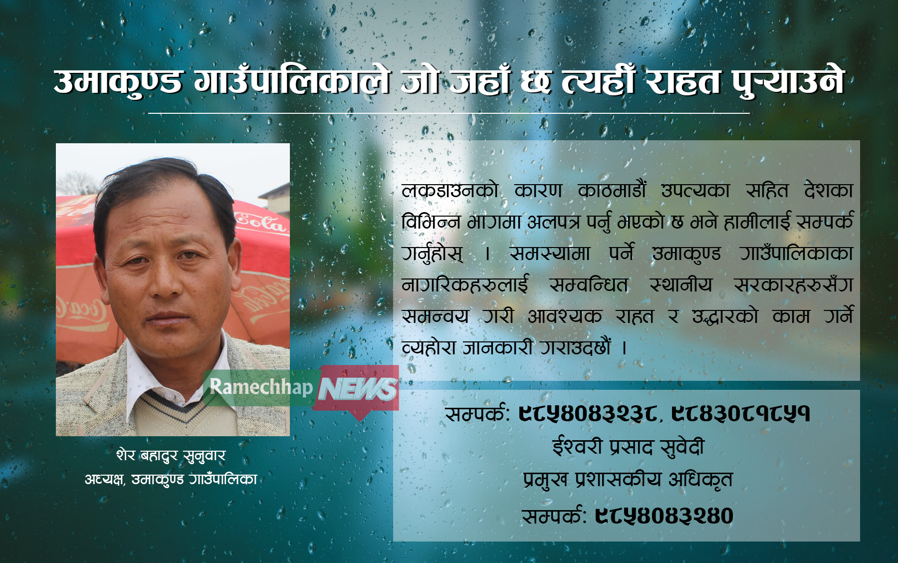 लकडाउनको कारण आफना नागरिकहरुलाई गाउँपालिका ल्याउन सम्भव नभएपछि रामेछापको उमाकुण्ड गाउँपालिकाले गाउँपालिका नागरिक भएकै ठाउँमा राहत पुर्याउने निर्णय गरेको छ । गाउँपालिकाले काठमाडौं उपत्यका सहित देशभर रहेका आफना नागरिकहरुलाई समन्वय गरेर राहत पुर्याउने निर्णय गरेको हो ।
