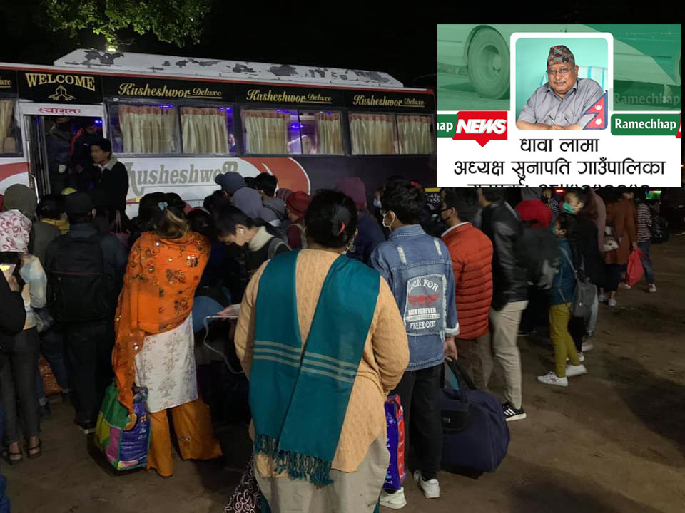 सुनापती गाउँपालिकाले लकडाउनको कारण काठमाडौंमा अलपत्र परेका आफ्ना नागरिकहरुलाई निशुल्क रुपमा उद्धार गरेको छ । स्थानीय प्रशासन र प्रहरीसँग सहकार्य गरेर काठमाडौमा अलपत्र परेका आफ्ना नागरिहरुलाई वसको व्यवस्था गरेर गाउँसम्म ल्याएको हो । सुनापती गाउँपालिकाका अध्यक्ष धावा लामाले पूर्व निर्धारित समय केही दिन धकेलिए पनि आफना नागरिकहरुलाई उद्धार गरेर गाउँ ल्याएको बताउनुभयो ।