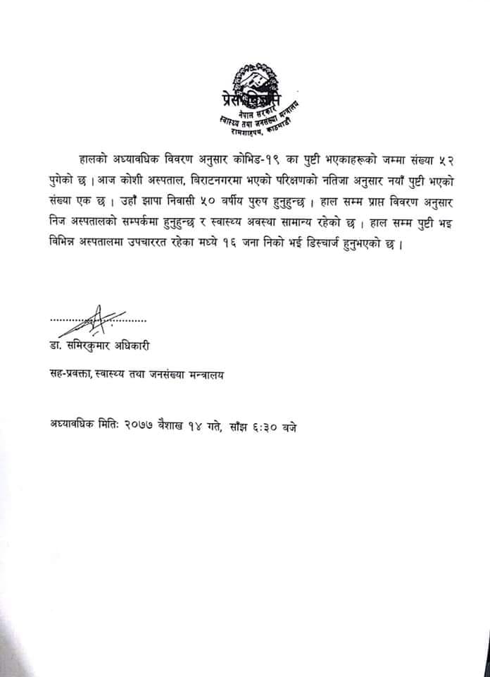 कोशी अस्पताल बिराटनगरमा भएको परीक्षणको नतिजाअनुसार एक संक्रमित थपिएका हुन्। योसँगै नेपालमा संक्रमितको संख्या ५२ पुगेको छ। यीमध्ये १६ जना निको भइ अस्पतालबाट डिस्चार्ज भएका छन् । नेपालमा हालसम्म ४१ हजार ४ सय ३६ जनामा आइडिटी परीक्षण गरिएको छ ।