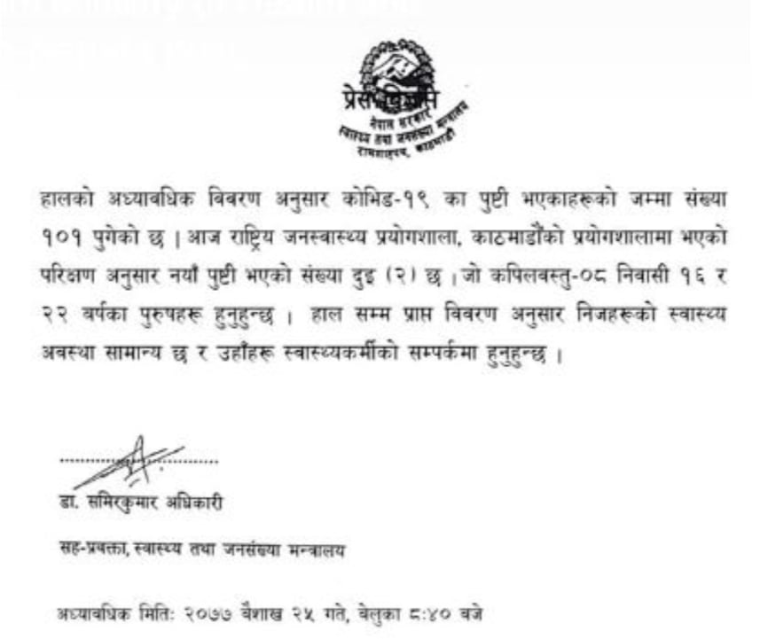 कपिलवस्तुमा भेटिए थप २ जना कोरोना संक्रमित, देशभर संक्रमितको संख्या १०१ पुग्यो