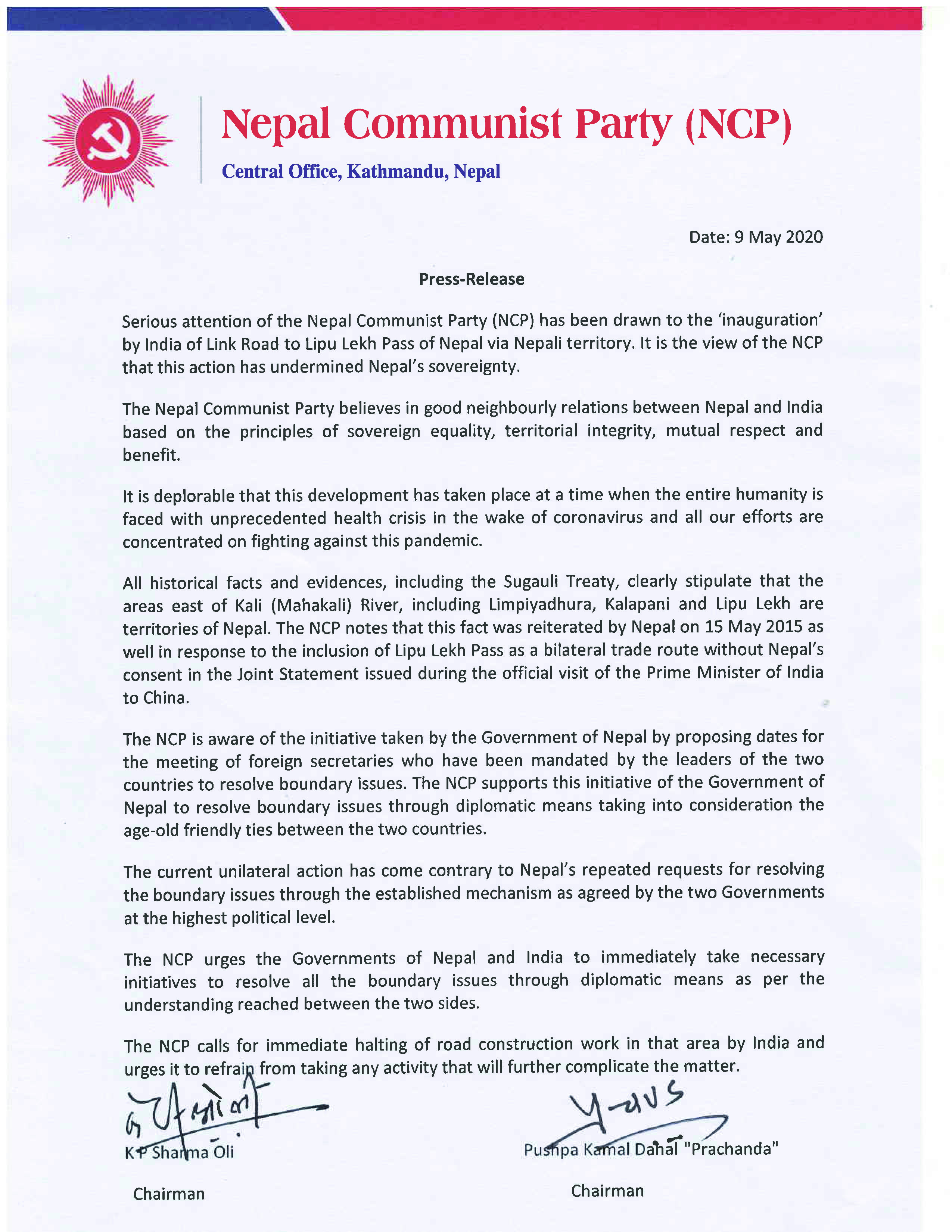भारतीय रक्षा मन्त्री राजनाथ सिंहले शुक्रबार नेपालको लिपुलेक पास हुदैँ चीनको मानसरोवर जोड्ने सडकको उद्घाटन गरेको थिए। नेपाल सरकारले उक्त कार्यलाई खेदजनक भनेको छ। नेकपाले सुगौली सन्धि अनुसार महाकाली नदी पूर्वको भूभाग लिम्पियाधुरा, कालापानी र लिपुलेक नेपालको भएको उल्लेख गरेको छ। नेपालले पटकपटक सचिव स्तरिय वार्ता मार्फत् सीमा विवाद सुल्झाउन गरेको पहललाई भारतले वेवास्ता गरेको नेकपाको वक्तव्यमा उल्लेख छ।