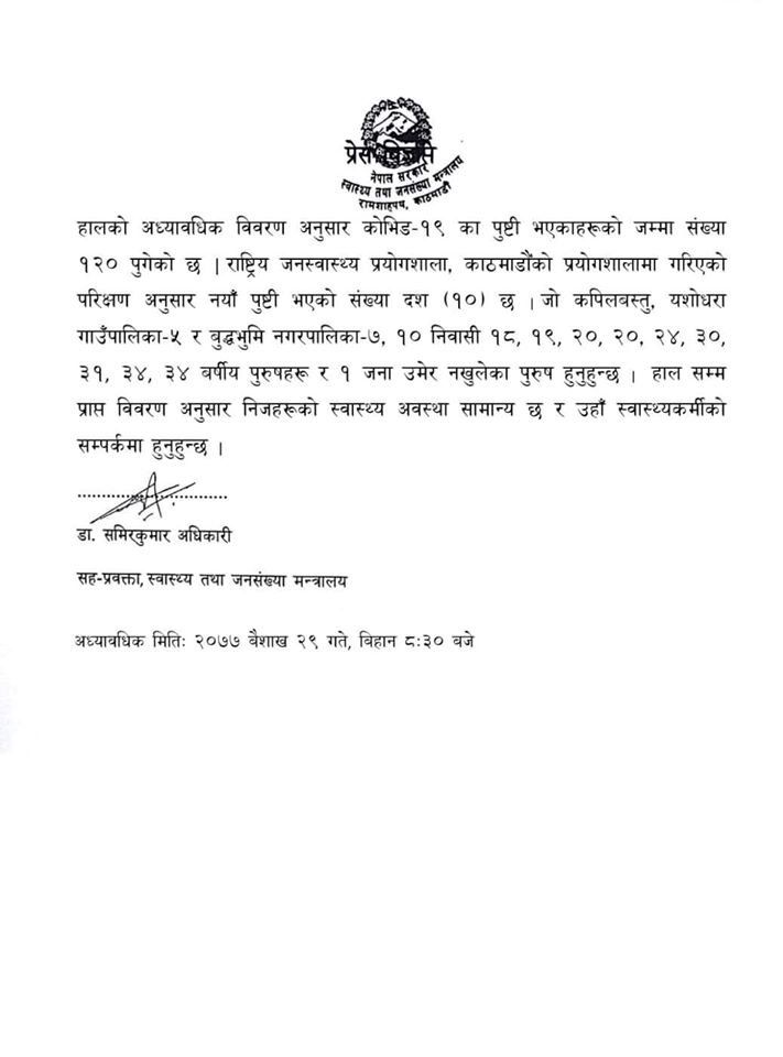स्वास्थ्य तथा जनसंख्या मन्त्रालयका अनुसार कविलवस्तुको यशोधरा गाउँपालिका–५ र बुद्धभूमि नगरपालिका– ७ र १० नम्बर वडाका १० जनामा कोरोनाभाइरसको संक्रमण देखिएको हो ।