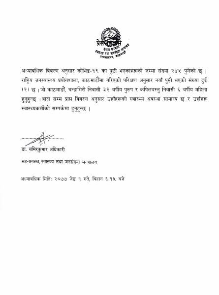 नेपालमा थप दुई जनामा कोरोना पुष्टि, संक्रमितको संख्या २४५ पुग्याे