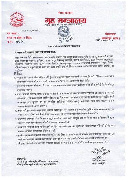 गृह मन्त्रालयले उपत्यकाभित्रका स्थानीय तहहरूलाई पठाएको छ बुँदे परिपत्रमा अत्यावश्यक कामबाहेक उपत्यका प्रवेशमा रोक लगाउने उल्लेख छ। कोरोनाको जोखिम देखिँदा अत्यावश्यक काममा बाहेक उपत्यका प्रवेश निषेध गर्ने र आगागमनको स्रोतमै रोक्ने गृहमन्त्रालयले पठाऐको परिपत्रमा भनिएको छ ।