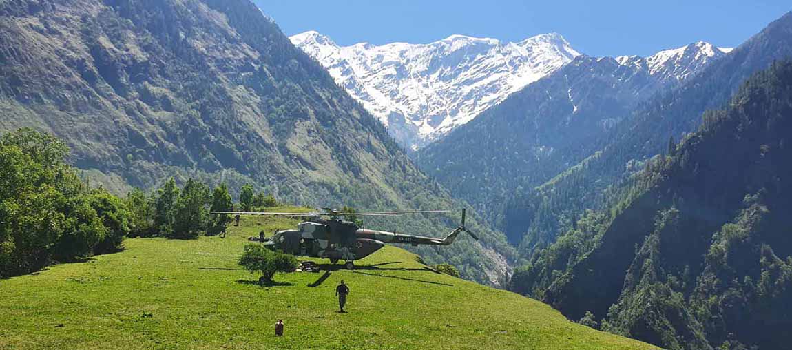 दार्चुलाको व्यास गाउँपालिका २ घाँटीबगर इलाकाको थी भन्ने स्थानमा बाटो निर्माणका लागि फौज बोकेर पुगेको नेपाली सेनाको एमआई १७ हेलिकप्टर । तस्बिर : नेपाली सेना