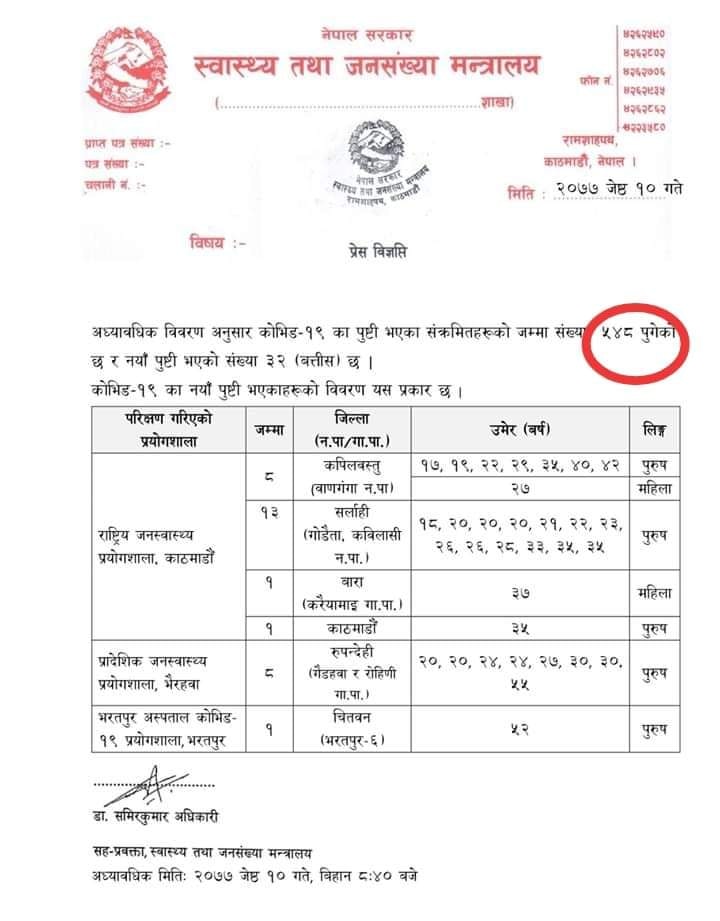 १० जेठ, काठमाडौं । नेपाल शनिबार थप ३२ जनामा कारोनाभाइरस संक्रमण पुष्टि भएको छ । कपिलवस्तु, सर्लाही, बारा, काठमाडौं, रुपन्देही र चितवनमा गरी ३२ जनामा संक्रमण पुष्टि भएको स्वास्थ्य तथा जनसंख्या मन्त्रालयले जनाएको छ । मन्त्रालयका अनुसार आज थपिएकासहित नेपालमा कुल संक्रमितको संख्या ५४८ पुगेको छ ।