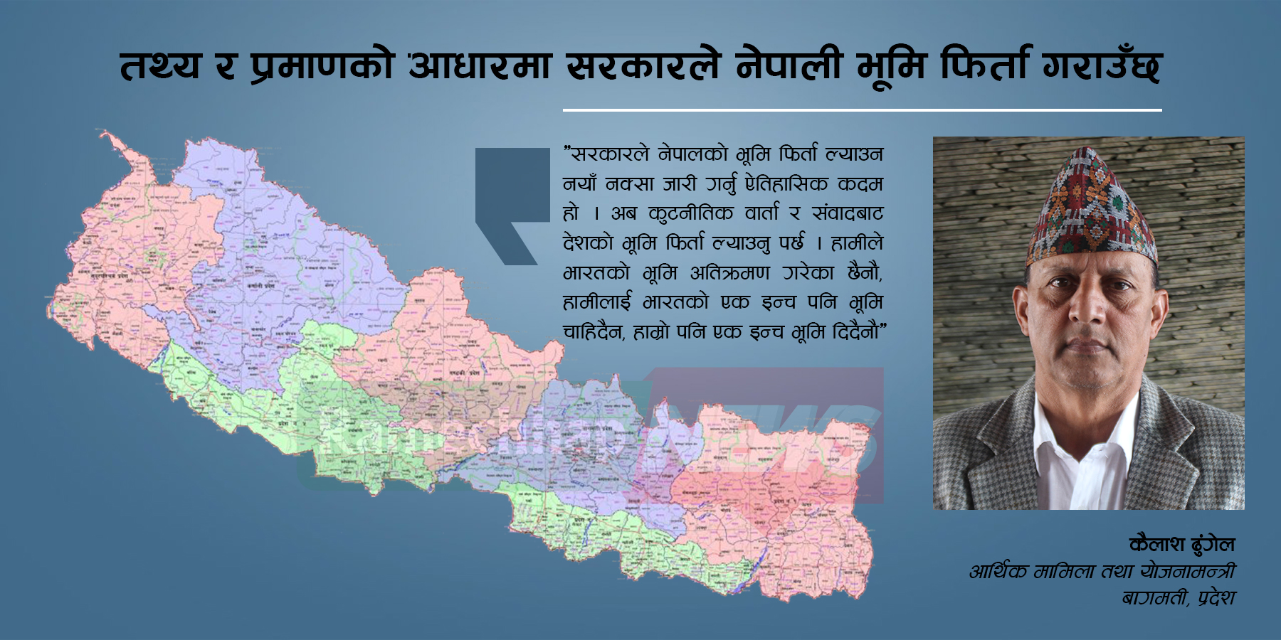 बागमती प्रदेशका आर्थिक मामिला तथा योजनामन्त्री कैलाश ढुंगेलले सरकारले जारी गरेको नयाँ ऐतिहासिक कदम भएको बताउनुभएको छ । उहाँले नेपाल सरकारसँग रहेको तथ्य र प्रमाणको आधारमा भारतले अतिक्रमण गरेको नेपाली भूमि फिर्ता हुने बताउनुभयो । नेकपाका केन्द्रीय सदस्य एवं रामेछापका सह–इन्चार्ज समेत रहनुभएका मन्त्री ढुंगेलले यस पटक भारतले अतिक्रमण गरेको नेपाली भूमि फिर्ता ल्याएरै छोडने विश्वास व्यक्त गर्नुभयो ।