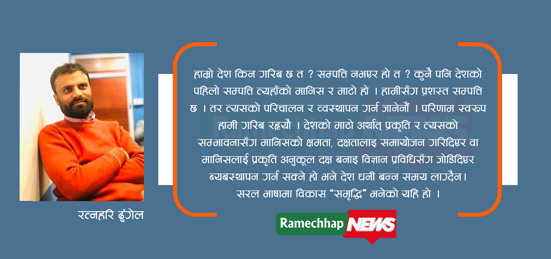 हाम्रो देश किन गरिब छ त ? सम्पत्ति नभएर हो त ? कुनै पनि देशको पहिलो सम्पत्ति त्यहाँको मानिस र माटो हो । हामीसँग प्रश्स्त सम्पत्ति छ । तर त्यसको परिचालन र व्वस्थापन गर्न जानेनौं परिणामस्वरूप हामी गरिब रह्यौ । देशको माटो अर्थात् प्रकृति र त्यसको सम्भावनासँग मानिसको क्षमता, दक्षतालाइ समायोजन गरिदिएर वा मानिसलाई प्रकृति अनुकूल दक्ष बनाइ विज्ञान प्रविधिसँग जोडिदिएर ब्यबस्थापन गर्न सक्ने हो भने देश धनी बन्न समय लाग्दैन। सरल भाषामा विकास , समृद्धि भनेको यहि हो ।