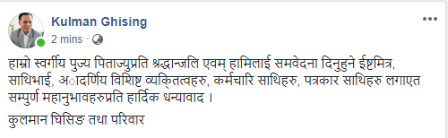 बुबाको निधनप्रति संमवेदना दिने सबैप्रति धन्यवाद दिन चाहन्छुः कुलमान घिसिङ