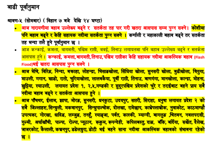 जिल्ला प्रशासन कार्यालय रामेछापले अविरल बर्षासँग जिल्लाभित्र नदी र खोलामा पानीको वहाप बढने सम्भावना रहकाले नदी किनारामा बसोबास गर्नेहरुलाई सचेत रहन आग्रह गरेको छ ।