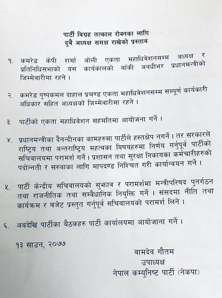 पार्टीभित्र एक महिनादेखि जारी आन्तरिक विवाद समाधानको लागि पार्टीका उपाध्यक्ष वामदेव गौतमले ६ बुँदे सहमतिको बुँदा अगाडि सार्नुभएको छ । उहाँले पार्टी अध्यक्षद्धय केपी शर्मा ओली र पुष्पकमल दाहाल ‘प्रचण्ड’बीच पटक–पटक भएको वार्ता सफल हुन नसकेपछि सहमतिको लागि ६ बुँदे सहमतिको खाका अगाडि सार्नुभएको छ । गौतमको प्रस्तावसँगै नेकपाभित्र सत्ता समिकरण फेरि फेरिवल भएको छ ।