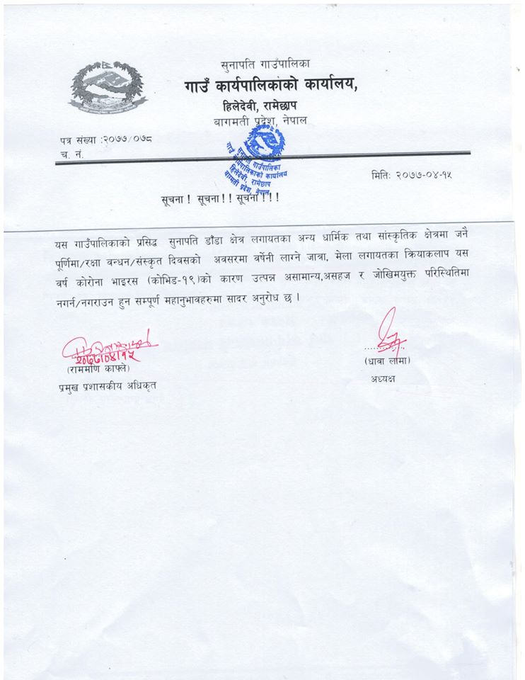सुनापती गाउँपालिकाका अध्यक्ष धावा लामा र प्रमुख कार्यकारी अधिकृत राममणि काफ्लेद्धारा संयुक्त रुपमा जारी गरिएको सूचनामा भनिएको छ,‘गाउँपालिकाको प्रसिद्ध सुनापति डाँडा क्षेत्र लगायत अन्य धार्मिक तथा सांस्कृतिक क्षेत्रमा जनै पूर्णिमाको अवसरमा बर्षेनी लाग्ने जात्रा मेला यस बर्ष कोरोना भाइरसको कारण उत्पन्न असामान्य परिस्थितिमा नगर्न सम्पूर्ण नागरिकहरुमा अनुरोध गरिन्छ ।’