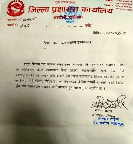 संकट व्यवस्थापन सञ्चालन केन्द्रका सह सचिव वासुदेव दाहालद्धारा पत्रमा भनिएको छ, सञ्चालनमा आएका भनिएका शैक्षिक संस्था सञ्चालनमा आए नआएको एकिन गरी आवश्यक कारवाही गरी केन्द्रलाई जानकारी गराउनु ।