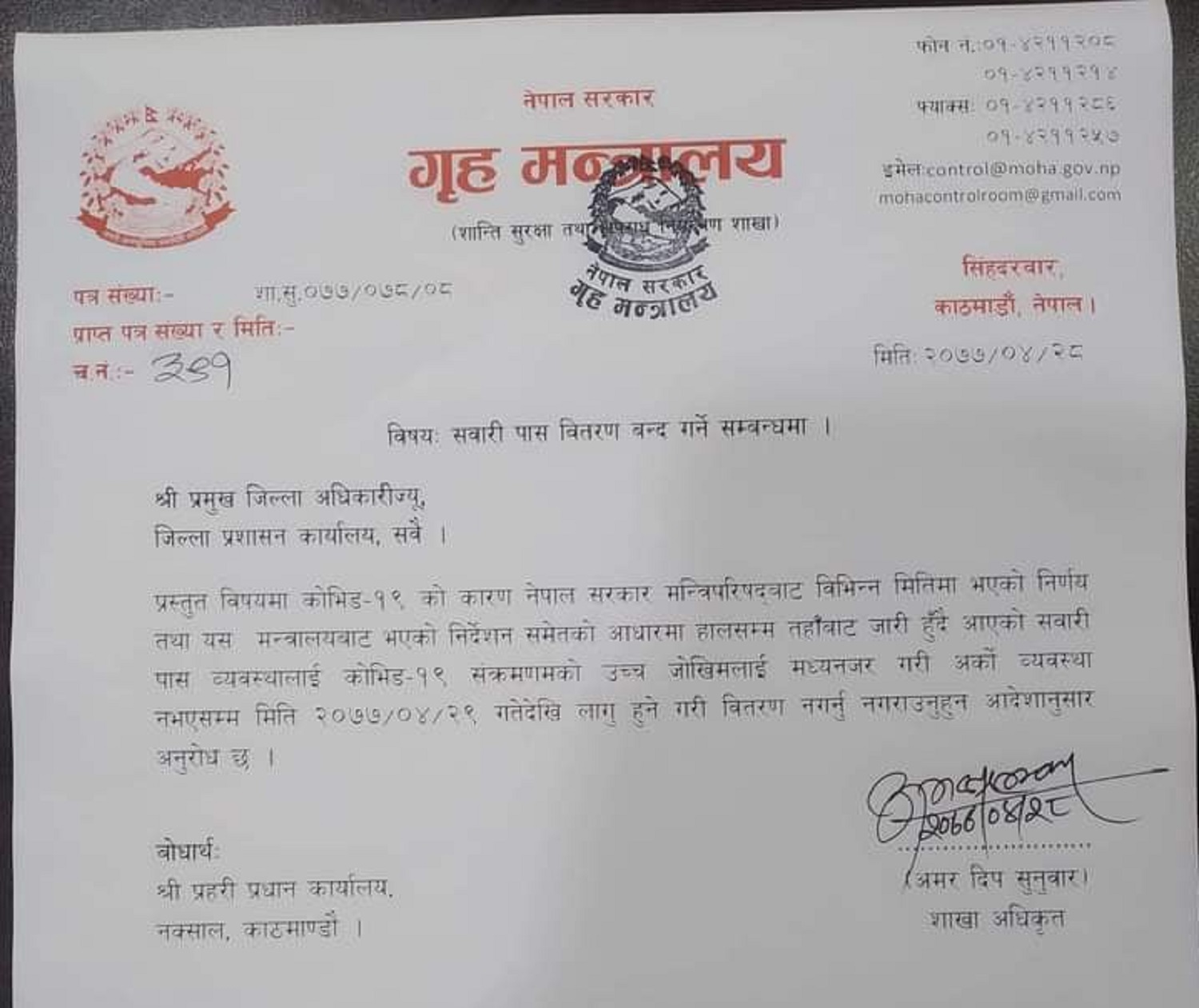 बिहीबारदेखि लागू हुने गरी पास वितरण बन्द गर्न गृह मन्त्रालयले ७७ वटै जिल्ला प्रशासन कार्यालयलाई बुधबार पत्राचार गरेको हो ।