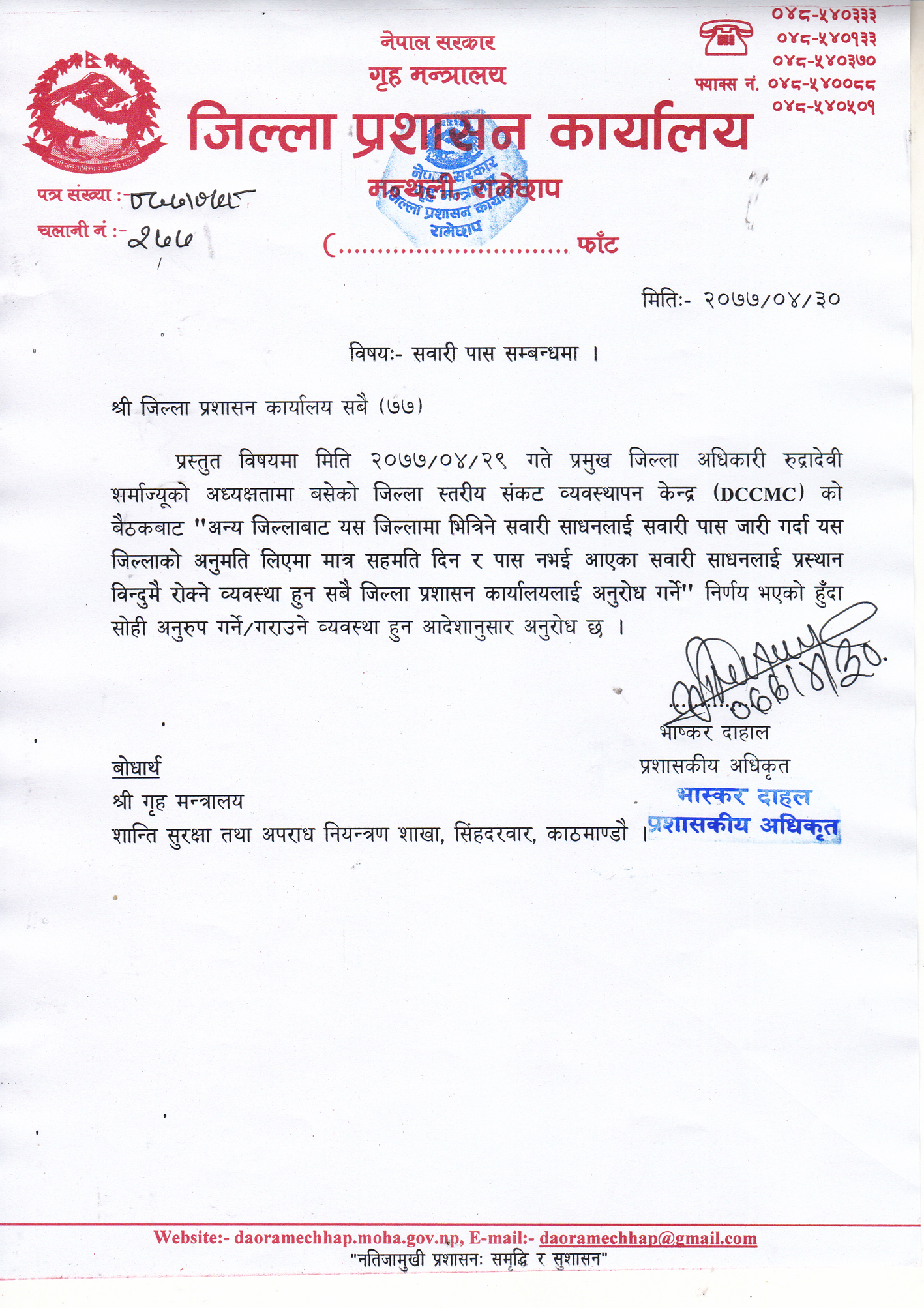 गृहमन्त्रालयले जिल्ला प्रशासनबाट पास जारी नहुने निर्णय गरेसँगै रामेछाप जिप्रकाबाट पनि सवारी सञ्चालनको पास जारी गर्ने काम रोकिएको छ । जिल्ला प्रशासन कार्यालय रामेछापले अन्य जिल्लाबाट सवारी पास नलिई आएका सवारी साधनलाई सीमा नाकामै रोक्ने निर्णय गरेको छ ।