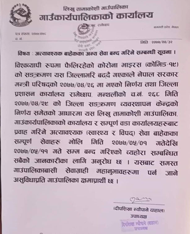 लिखु तामाकोसी गाउँपालिकाका उपाध्यक्ष दीपशिखा दाहालद्धारा जारी सूचनामा जिल्ला संक्रमण व्यवस्थापन केन्द्रको निर्णय अनुसार गाउँपालिको कार्यालय र सम्पूर्ण वडा कार्यालयहरुबाट प्रवाह गरिने अत्यावश्यक सेवा बाहेकका सेवा बन्द गर्ने निर्णय गरिएको छ ।