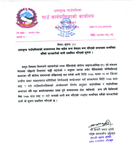 उमाकुण्ड गाउँपालिकाका प्रमुख प्रशासकीय अधिकृत ईश्वरी प्रसाद सुवेदीका अनुसार पछिल्ला दिनमा नेपालभर कोरोना संक्रमण बढदै गएको र समुदाय स्तरमा समेत फैलिन सक्ने परिस्थितिलाई मध्यनजर गरेर जिल्ला स्तरीय संकट व्यवस्थापन समितिको निर्णयलाई कार्यान्वयन गर्न अत्यावश्यक बाहेकका सेवा बन्द गरिएको उल्लेख गरिएको छ ।