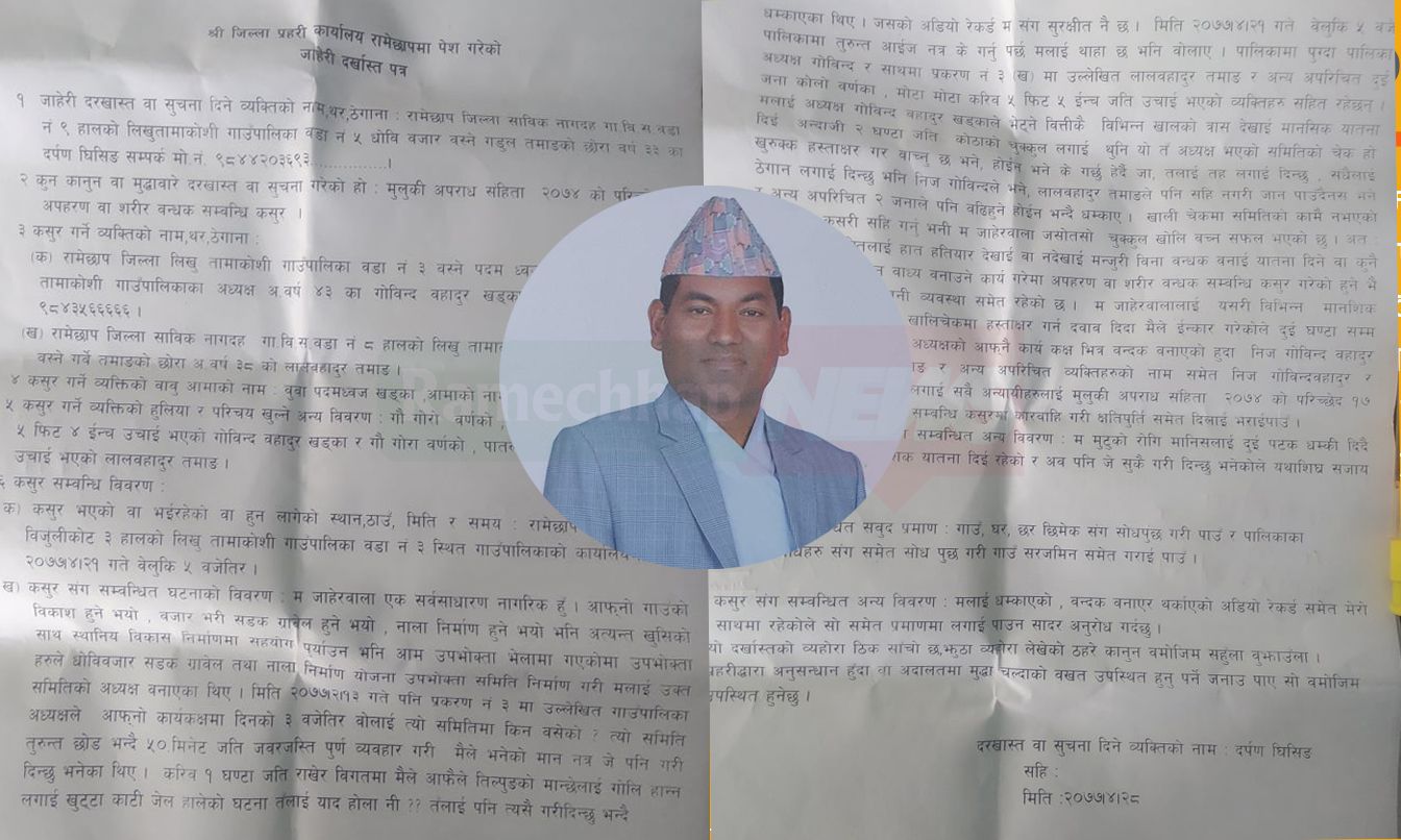 त्यो समिति तुरुन्त छोड भन्दै ५० मिनेट जति जबरजस्तीपूर्ण व्यवहार गरी मैले भनकेो मान नत्र जे पनि गरी दिन्छु भनेका थिए । करिब १ घण्टा जति राखेर विगतमा मैले आफैले तिल्पुङको मान्छेलाई गोली हान्न लगाई खुट्टा काटी जेल हालेको घटना तलाई याद होला नि । तलाई पनि त्यस्तै गरिदिन्छु भन्दै धम्क्याएका थिए । जसको अडियो रेकर्ड मसँग सुरक्षित नै छ । मिति २०७७।४।२१ गते बेलुकी ५ बजे पालिकामा तुरुन्त आइज नत्र के गर्नुपर्छ मलाई थाहा छ भनि बोलाए । पालिकमा पुग्दा पालिका अध्यक्ष गोविन्द खडकाको साथमा लालबहादुर तामाङ र अन्य अपरिचित दुई जना व्यक्तिहरु सहित रहेछन ।