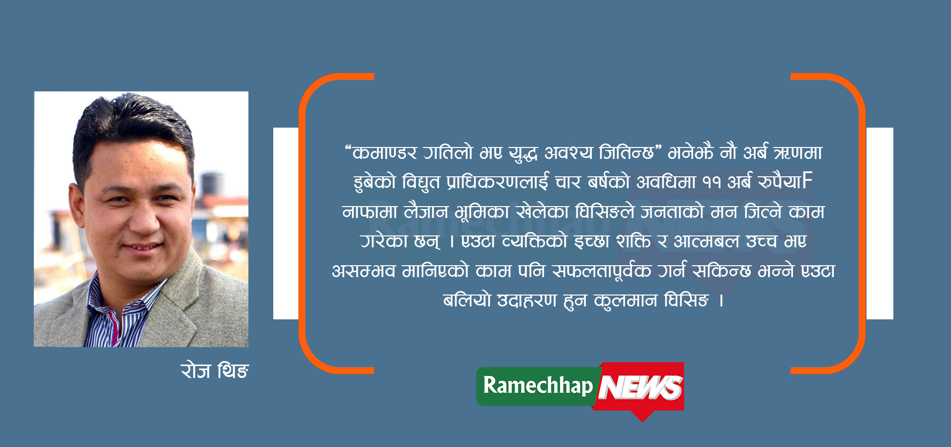 एउटा व्यक्तिको इच्छाशक्ति र आत्मबल उच्च भए असम्भव मानिएको काम पनि सफलतापूर्वक गर्न सकिन्छ भन्ने एउटा बलियो उदाहरण हुन कुलमान घिसिङ । विद्युत प्राधिकरणभित्र बर्षौदेखि रहेको विकृति र विसंगतिको चाङ छिचोल्दै चुनौती र धम्कीको सामना गर्दै अवरोधको बाटो पन्छाउन सकेकै कारण आज कुलमान बन्न पुगेका हुन् । उनले चुनौतीको सामाना गरे, अवरोध पन्छाउने आँट गरे । दृढ आत्मविश्वास भएकै कारण असम्भव मानिएको काम सफलतापूर्वक सम्पन्न गरेर जनताबाट स्याबासी पाए ।