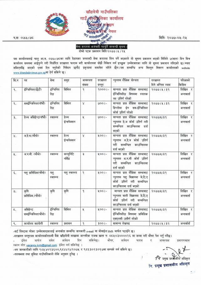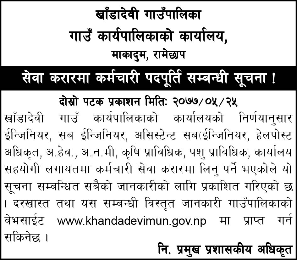 खाँडादेवी गाउँ कार्यपालिकाको निर्णयअनुसार ईन्जिनियर, सब ईन्जिनियर, असिस्टेन्ट सब इन्जिनियर, हेलपोष्ट अधिकृत, अहेव, अनमी, कृषि प्राविधिक , पशु प्राविधिक, कार्यालय सहयोगी लगायतको कर्मचारी सेवा करारमा लिनु पर्ने भएकाले सूचना प्रकाशित गरेको जनाएको छ । दरखास्त तथा यस सम्बन्धी विस्तृत जानकारी गाउँपालिकाको वेभसाईट https://khandadevimun.gov.np/ मा प्राप्त गर्न सकिने सूचनामा उल्लेख गरिएको छ ।
