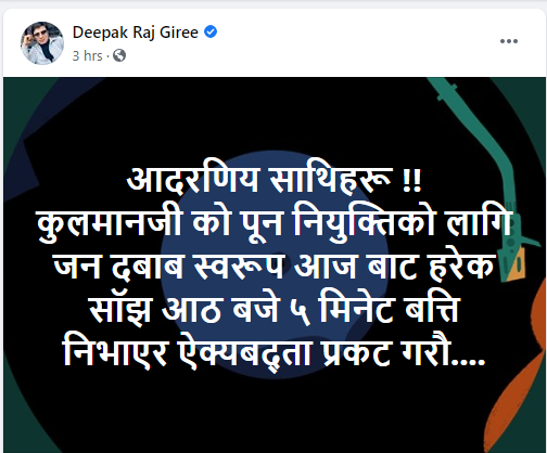 दीपकराज गिरीकाे अपिलः कुलमानको पुनर्नियुत्तिको लागि साँझ ५ मिनेट बत्ति निभाएर एक्बद्धता प्रकट गरौं