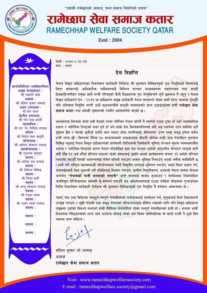 वैदेशिक रोजगारीको शिलसिलामा कतारमा रहेका रामेछापवासीले चार बर्षे कार्यकाल सकिएसँगै प्राधिकरणबाट विदा हुनुभएका नेपाल विद्युत प्राधिकरणको निवर्तमान कार्यकारी निर्देशक कुलमान घिसिङलाई पुनः नियुक्ति गर्नुपर्ने काम गरेका छन् । रामेछाप सेवा समाज कतारले एक विज्ञप्ति प्रकाशित गरी कुलमानको योग्यता र दक्षतालाई सरकारले विद्युत विकासमा प्रयोग गर्न आग्रह गर्दै पुनः नियुक्ति गर्नुपर्ने माग गरेका हुन् ।